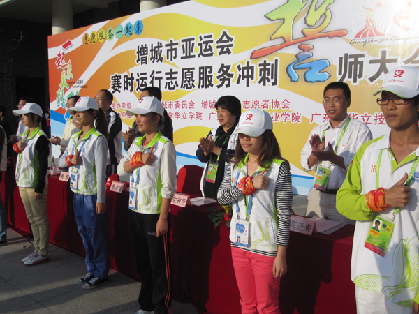 11月9日下午,由共青团增城市委员会、增城市青年志愿者协会联合主办,广东工业大学华立学院等兄弟院校承办的增城市亚运会赛时运行志愿服务冲刺誓师大会在我院综合楼广场隆重举行。增城市团市委书记邓海军、副书记赖辉、副书记及增城龙舟场馆观众服务经理陈伟,广州华立投资有限公司总经理叶雅明、副总经理黄敬东,广东工业大学华立学院常务副院长詹业宏、党委书记胡志先,各兄弟院校等领导嘉宾及增城志愿者代表共2000多人参加大会。