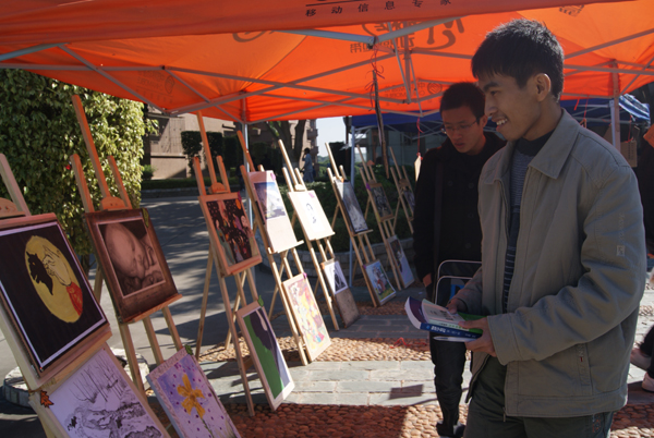 画展在食堂通道两侧搭起的简易摊点内举行。临时支起的画架成了展板,画架上摆放着素描、色彩、版画、油画、国画、漫画等各类作品80幅,这些作品是我院艺术系的专业老师与高年级同学,通过初审和复审,从2010届艺术新生创作的230幅作品中评选出来的。