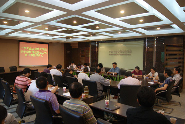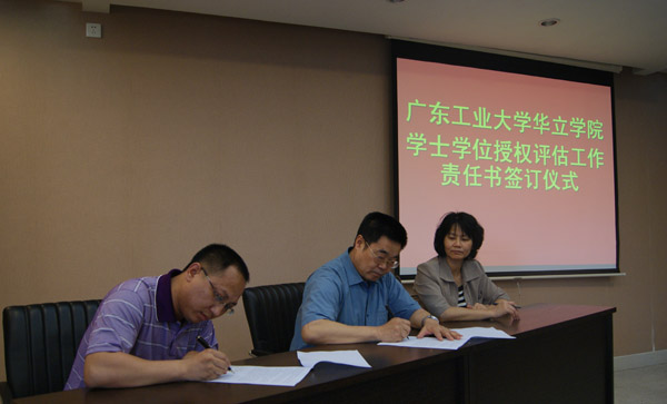 首先,由詹业宏常务副院长和王锦秀书记代表学院与各部门负责人签订广东工业大学华立学院学士学位授权评估工作责任书。各部门保证以高度负责的态度认真对待学士学位授予权评估工作,将组织最好最大的力量投入该项工程,以评促建、以评促改、以评促管、评建结合、重在建设,保证完成学院交代的各项任务。