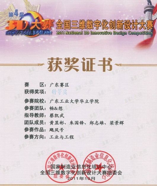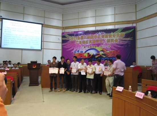 10月22-23日,第四届全国三维数字化创新设计大赛广东赛区复赛评审、获奖作品颁奖会在五邑大学隆重举行。广东工业大学华立学院积极组织学生参加此次比赛,共有20多支团队报名参赛。学院经过精心评比,优中选优,选报了2支参赛队伍,选送了2个参赛作品。选送的作品设计新颖,体现了很高的创新性和观赏性,获得了评委们的一致好评。经过学校初赛、网络公示投票、作品资格审查、赛区网络评审,广东工业大学华立学院选送的作品“飓风号”获得特等奖、“人力汽车”获得三等奖。“飓风号”作品将代表广东省赛区参加全国3D大赛现场总决赛。
