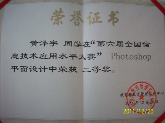 我艺术设计与计算机学部的黄泽宇同学在全国总决赛中经过5小时的紧张比赛,充分发挥了自己的技术水平,奋力拼搏,完成的作品得到了评委们的一致认可,最终获得了全国二等奖(Photoshop平面设计组)。