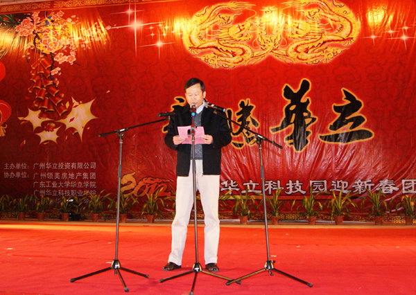 晚会开始,首先由广州华立投资有限公司总经理叶雅明致辞,他代表张智峰董事长对在华立园辛勤耕耘的广大教职员工致以春节的问候和致意。他指出,在过去的一年中,在张智峰董事长的领导和广大师生员工的共同努力下,华立园各项事业蒸蒸日上,希望大家继续保持昂扬的精神,迎接新一年的到来,推动华立园各项事业深入发展。在致辞中,叶雅明总经理对广东工业大学华立学院顺利通过学士学位单位及专业评审表达了热烈的祝贺。