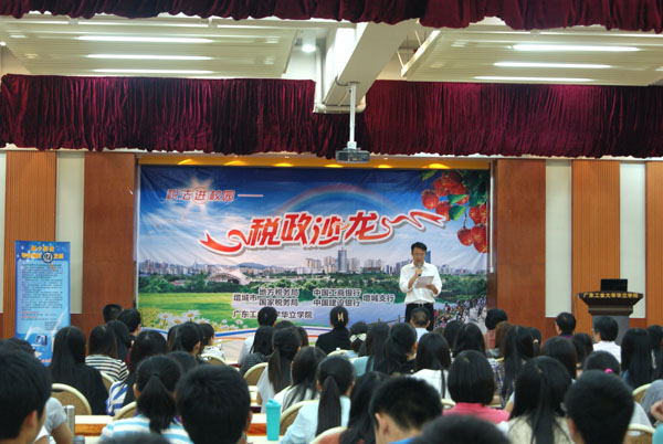 增城市国家税务局副主任科员李强为同学们作了一场题为“税务连着你我他,诚信纳税靠大家”的讲座,他向大家介绍了纳税的意义、税收的宣传月主题以及怎样有效预防假钞票等内容。增城市国家税务局陈苑科长为我们介绍了税法知识,如地税征收的税种、个人所得税、如何辨别发票的真伪等。增城市国家税务局党组成员、总经济师熊万里为本次沙龙作了总结发言,他希望大家多多了解税务知识,提高纳税意识,努力做好税法普及工作。活动当中,还穿插了一些税政知识抢答和提问环节。通过这次税政沙龙活动,大大了拓展我院师生的税务知识,提高了学院师生的纳税意识。