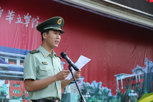 随后,中国人民武装警察边防部队广州指挥学校领导李三毛中校讲话,他为大家介绍了此次军训的筹备情况以及军训过程中的相关细节和注意事项;紧接着教官代表高鹏同志、教师代表李伟文老师与新生代表陈睿禧同学相继发言,提出了要求,表达了祝福。最后,在全体师生注目中,章云副校长将军训团团旗授予中国人民武装警察边防部队广州指挥学校领导李三毛中校。2012级开学典礼暨军训动员大会圆满结束。