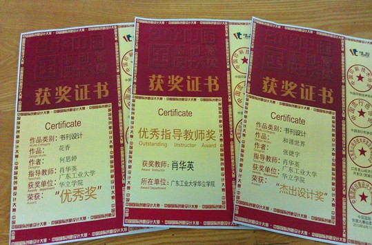 在我院教师的精心指导下,我院传媒与艺术设计学部学生首次参加比赛就取得了可喜的成绩:其中张捷宇同学的作品《和谐世界》获“杰出创意奖”,何思婷同学的作品《花香》获“优秀奖”,指导教师肖华英荣获“优秀指导教师”称号。