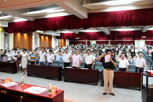 参会师生党员首先观看了2012-2013学年学院党委和各党总支工作回顾视频。大会第二项:举行新发展党员入党宣誓仪式,188名新发展党员面向党旗进行庄严宣誓,宣誓由党委委员、常务副院长詹业宏领誓,党委委员广树建监誓,通过宣誓使新党员铭记党员的责任和义务。
