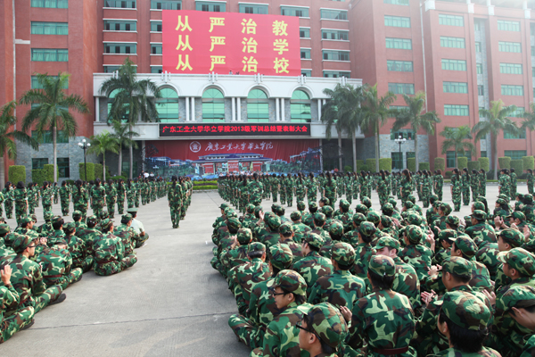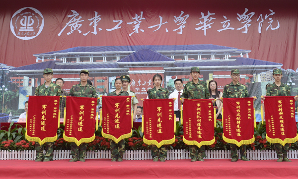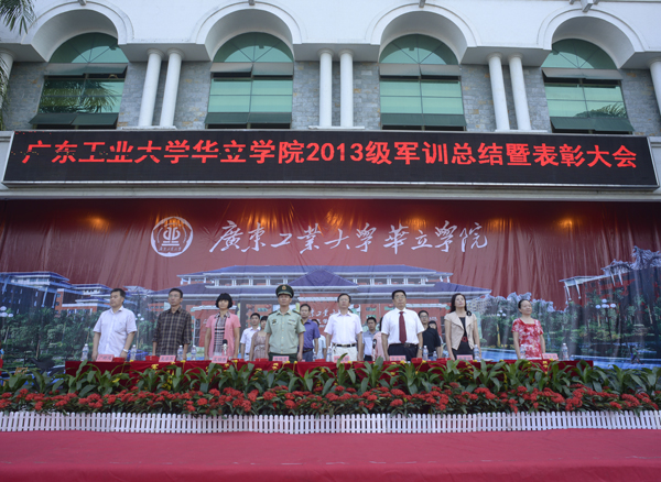 最后,王锦秀书记从承训部队领导手中接回军训团团旗。至此,广东工业大学华立学院2013级新生军训圆满结束。