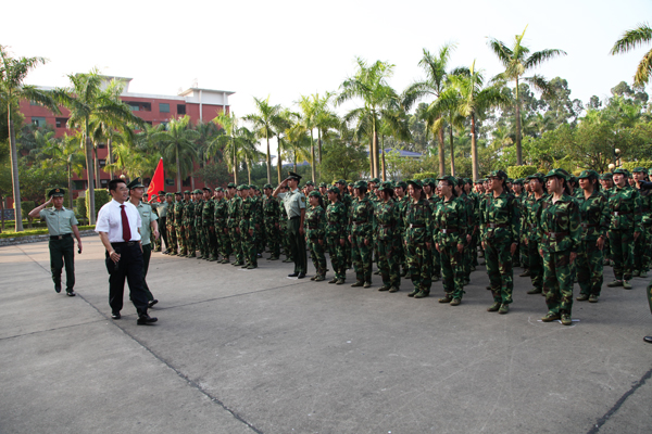 9月13日上午,我院在综合楼前广场隆重举行2013级新生军训阅兵暨总结表彰大会。学院董事会叶雅明副董事长,中国人民武装警察部队广州指挥学院陈伟忠少校,院领导詹业宏、王锦秀、柏育红、王学军及相关部门负责人出席了阅兵式。大会由党委书记王锦秀主持。