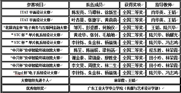 经过初赛和复赛,我院参赛队伍进入了“北银消金杯”电子商务与互联网金融大赛、ITAT平面设计大赛、“STC杯”单片机系统设计大赛、“Rigol杯”电子系统设计大赛、“中兴杯”安卓智能终端创意大赛等项目的全国决赛,最终获得6项全国二等奖,3项全国三等奖,创历年参赛最好成绩。
