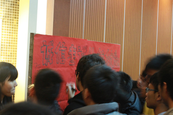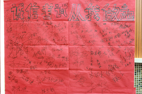 会后,同学们纷纷在“诚信考试,从我做起”倡议书上签上了自己的名字。