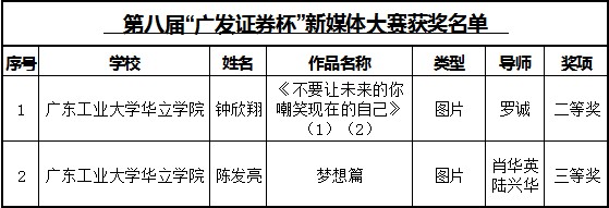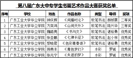 我院学子在第八届广东大中专学生校园文化艺术节系列比赛中喜获佳绩 作者:校团委 发布时间:2014-01-05 00:00:00 浏览次数:次 【字体:小 大】 近日,由共青团广东省委员会、广东省教育厅、广东省文化厅、广东省学生联合会共同举办的第八届广东大中专学生校园文化艺术节之书画艺术作品大赛、首届“广发证券杯”新媒体大赛决赛已圆满落幕。经过全省初选以及终审,大赛已圆满结束,我院参赛选手获得良好的成绩。 分享到: 【打印正文】
