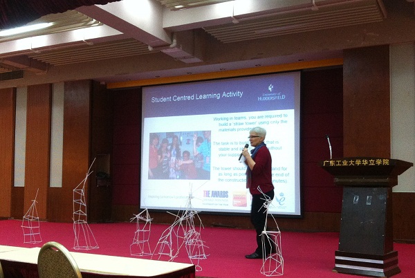 讲座伊始,Lyn Hall教授介绍了哈德斯菲尔德大学的地理位置、周边环境,并就该院课程设置、校内设施和学生活动等情况进行了详细全面地介绍。讲座上,Lyn Hal教授还与学生们玩起了“游戏”。她把每10名学生分为一组,并给每组分配两包塑料吸管,规定学生们在5分钟内用塑料吸管摆成一座塔。各个小组经过组员们的分工与合作,一座座塔顺利完成。游戏结束后,Lyn Hall教授为搭建了最高塔的团队赠送了小礼物。游戏虽小,意义非凡,Lyn Hall教授在告诉同学们团队合作精神和沟通交流重要性的同时,也展示了一种全新的教学方式。