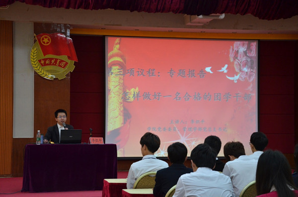 庄严澎湃的团歌声拉开了此次培训课的序幕。本次团校培训的第一讲由李炽平书记主讲。书记围绕“如何凝聚团学干部正能量”展开了精彩的讲述并表示作为团学干部必须具备大局意识、创新意识、服务意识、合作意识才能推动我院团学工作更好更快的发展。书记希望我院团学干部能永远跟党走,深入贯彻党的领导方针,并不断提升自身的综合素质,传递正能量。