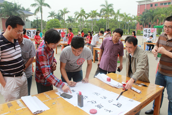 为了弘扬伟大的中华民族精神,提高我院学子的审美情趣和人文修养,我院于4月23日在综合楼前广场隆重举行广东省大学生艺术展演之书画大赛。出席本次大赛的领导嘉宾有:广东省知名画家、广州美院教授、我院客座教授吴山人,广州农商行增城中心支行行长、中国MBA联盟副主席、著名书画家麦愈强,著名书画家林祥清,学院常务副院长詹业宏,以及各职能部门领导。