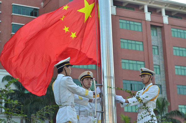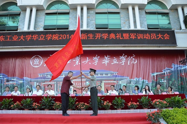 在热烈的掌声中,章云院长向军训团团长授旗。至此,2014级开学典礼暨军训动员大会圆满结束。