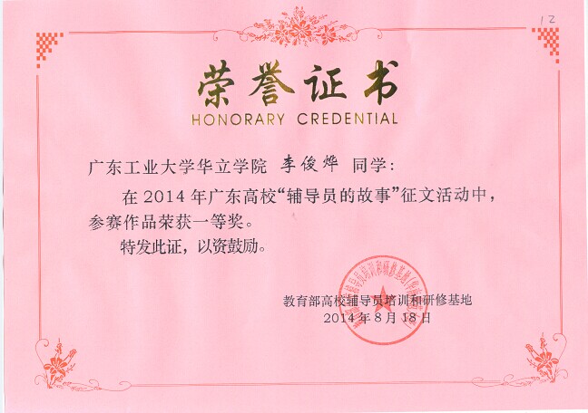 近日,2014年广东省“辅导员的故事”征文活动评选结果揭晓,我院传媒与艺术设计学部12新闻1班李俊烨同学的作品在本次评比中获得一致好评,荣获一等奖。