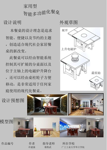 2014第七届全国三维数字化设计大赛广东赛区复赛在其大赛官网公布了获奖名单,经过网络公示投票、作品资格审查、赛区网络评审等环节,在蔡凯武老师指导下,我院提交的7个参赛作品,成绩喜人。其中,作品“Asha设计组”获得了特等奖;“液压多功能椅”、“新型滑板车”两件件作品获得一等奖;“发条储能单车”、“‘变色龙’模块化无人机”、“半智能垃圾桶”、“洗碗机”四件作品获得大赛二等奖。并且,特等奖作品将代表广东赛区前往江苏省常州市科技城参加全国总决赛。