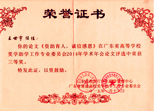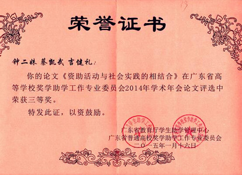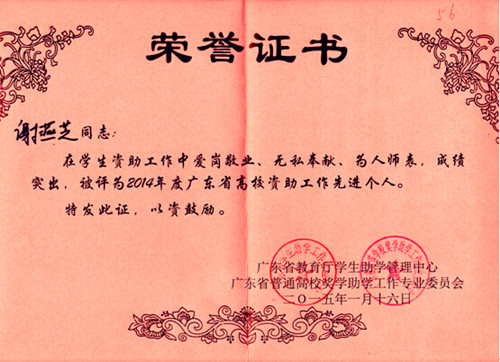 此次表彰中,我院谢燕芝老师被评为“2014年度广东省高校资助工作先进个人”;钟二妹、蔡凯武、吉健礼3位老师的论文《资助活动与社会实践的相结合》和任佳老师的论文《资助育人,诚心感恩》均荣获“广东省高等学校奖助学工作专业委员会2014年学术年会论文三等奖”。 学院在此表示祝贺!
