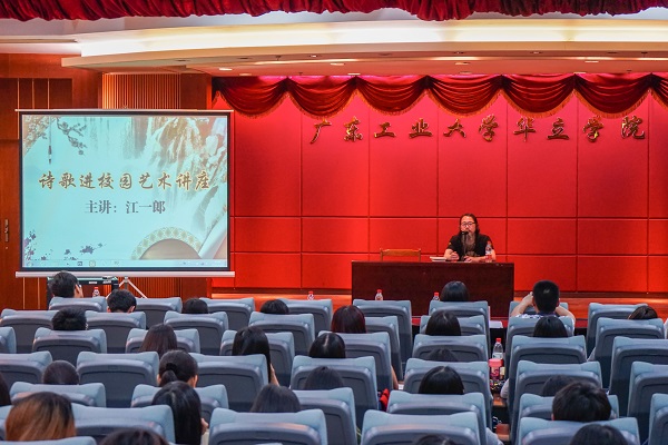 4月24日,我院于图书馆二号报告厅开展诗歌进校园艺术讲座,出席本次活动的领导嘉宾有:浙江省诗歌创作委员会副主任、首届华文青年诗人奖、人民文学杂志社诗赛一等奖、著名诗人江一郎,增城市精神文明办主任刘艳媚,学院团委书记罗诚,副书记赵小林。本次讲座由江一郎老师担任主讲。