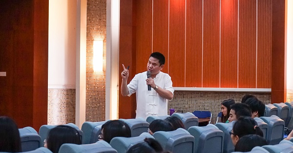 首先,王老师深入浅出的向我们阐释国学的定义。他表示周易是中华国学文化的根基,而易传、易经、易字则是中华文化三部曲。从中国传统文化到儒释道,处处蕴涵国学的奥妙。儒家思想倡导仁爱,王老师希望我们在生活中能以友善之心、宽厚待人,以及从国学的角度与我们探讨为上大学的目的,并与我们分享为人处事的秘诀:用善的眼睛看待周围的事物;说话办事要用善的语言;见人短命法;遇物价高法。