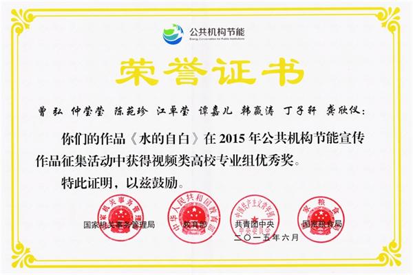 由国家机关事务管理局、教育部、共青团中央、国家粮食局主办,中国教育后勤协会、中国节能环保集团公司、汉能控股集团有限公司承办的2015年公共机构节能宣传作品征集活动经学校初评、网上评选、现场集中评选、公示和主办单位审定,共有145件平面设计类和视频类作品获得各类奖项。 此次活动的主题是“厉行节约,反对浪费”。参赛作品均以节点、节水、节粮为重点,宣传节约能源资源、保护生态环境、应对气候变化、推进生态文明建设的必要性和重要性,传播低碳环保理念,倡导勤俭节约行为,营造公共机构特别是大、中学校积极参与节约型社会建设的良好舆论氛围。 在本次比赛中,我院曾弘等八名同学拍摄制作的公益宣传片《水的自白》荣获视频类高校专业组优秀奖。