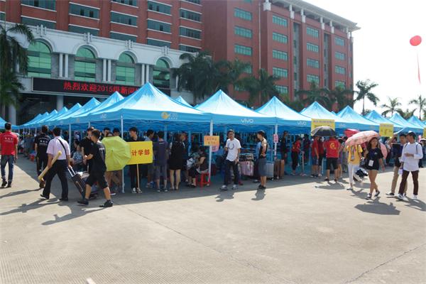 此次迎新校外接送点有五个:广州火车站、天河客运站、光明车站、增城汽车总站以及三江路口,也有的学生家长自驾车前往学校。23号一大早,学院综合楼前帐篷林立,整齐有序,各学部大本营一字型排开,做好迎接新生的准备。迎新人员对新生及家长彬彬有礼、热情接待、服务周到,受到了家长和新生的好评。