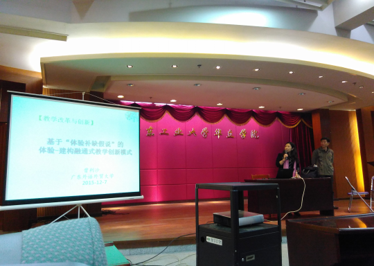 12月7日下午,我院在二号报告厅举办毓秀讲堂第四讲——体验式教学,由广东外语外贸大学国际商务英语学院的曾丽沙教授主讲。曾教授现任广东省外国语言学会理事、广东省译审资格评定委员会专家委员、广州市外事翻译学会理事、广州市公共场所英文译名专家委员。