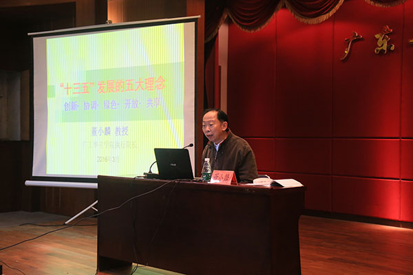 董小麟院长先从“十二五”期间取得的重大成就为切入点,过渡到“十三五”规划的主题,详细阐述了创新、协调、绿色、开放、共享等五大理念,并从这五大理念分析破解中国“十三五”期间发展的难题,实现全面建成小康社会的目标。