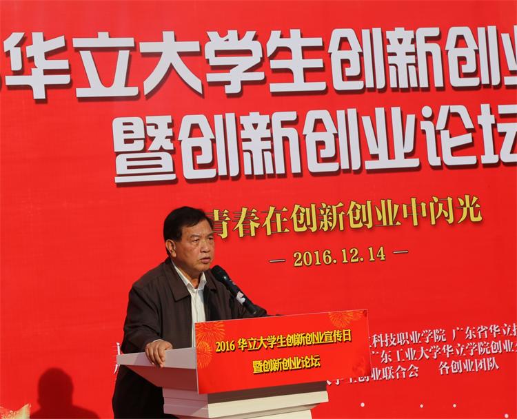 12月14日,由华立创新创业园主办,广工华立学院、广州华立科技职业学院、广东省华立技师学院承办的以“让青春在创新创业中闪光“为主题的2016华立大学生创新创业宣传日暨创新创业论坛在科技楼前广场隆重举行。出席本次活动的领导与嘉宾有:团省委青少年事业促进中心副主任朱瑞峰,增城区人力资源和社会保障局副局长宋叔铭、创业科科长张庆华,广东加博汇电子商务有限公司副总经理喻文涌,广州华立投资有限公司总经理叶雅明,广州华立科技职业学院党委书记林伟健、院长助理马俊,广东省华立技师学院院长潘钊国、常务副院长高尧来,华立创新创业园总经理陈炽、总监刘志超,以及相关部门负责人。