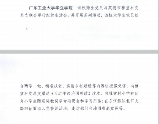 今年,在党的十九大来临之际,我院党委落实“两学一做”学习教育常态化制度化,组建大学生党员暑期社会实践队前往英德市东华镇开展“践行两学一做喜迎十九大,助力脱贫共建美丽乡村”主题社会实践活动,取得了圆满成功。