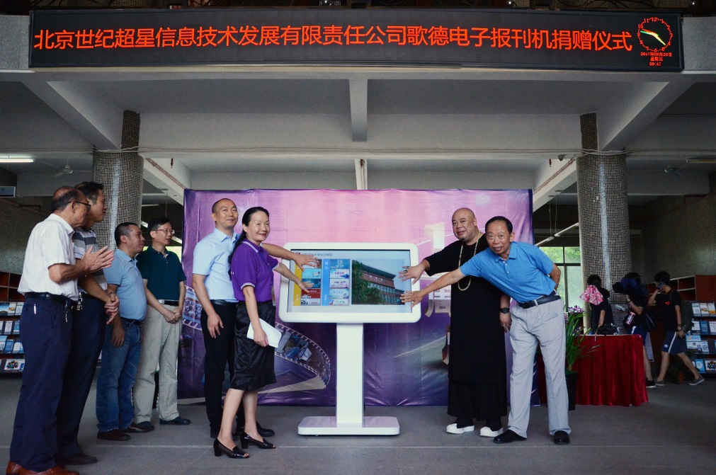 首先,举行了北京世纪超星信息技术发展有限责任公司哥德电子报刊机捐赠仪式。广州华立投资有限公司董事长张智峰、北京世纪超星信息技术发展有限责任公司副总经理尚景伟、广东工业大学华立学院执行院长董小麟、图书馆馆长赖卫桥共同触屏开启歌德电子读报机,就此拉开了馆庆十周年庆典活动的帷幕。