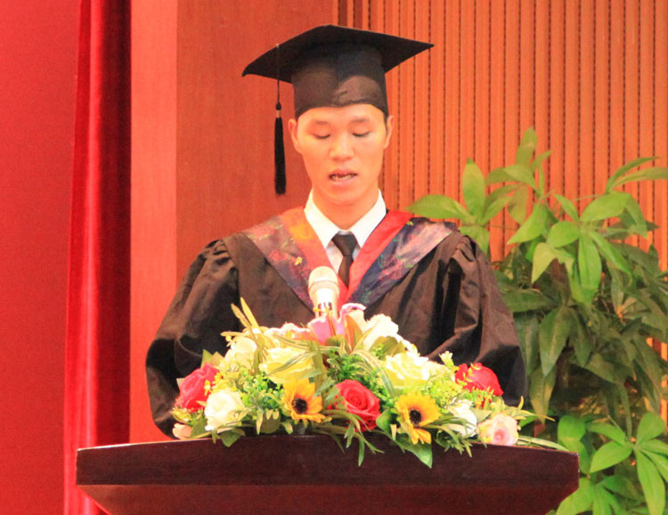 教师代表——城建学部黄红梅老师向即将踏上人生新征程的14级毕业生献上祝福:希望所有毕业生在未来的岁月里,羽翼丰满,勇敢顽强!带着勇气、知识、信念、追求去创造自己的新生活!在今后的人生道路上,一路拼搏,一路精彩!优秀毕业生代表——机电学部14机械1班曾宏锦表代表全体毕业生表达了他们对母校的由衷感激和不舍之情,离别之际为母校送上了最真挚的祝福。
