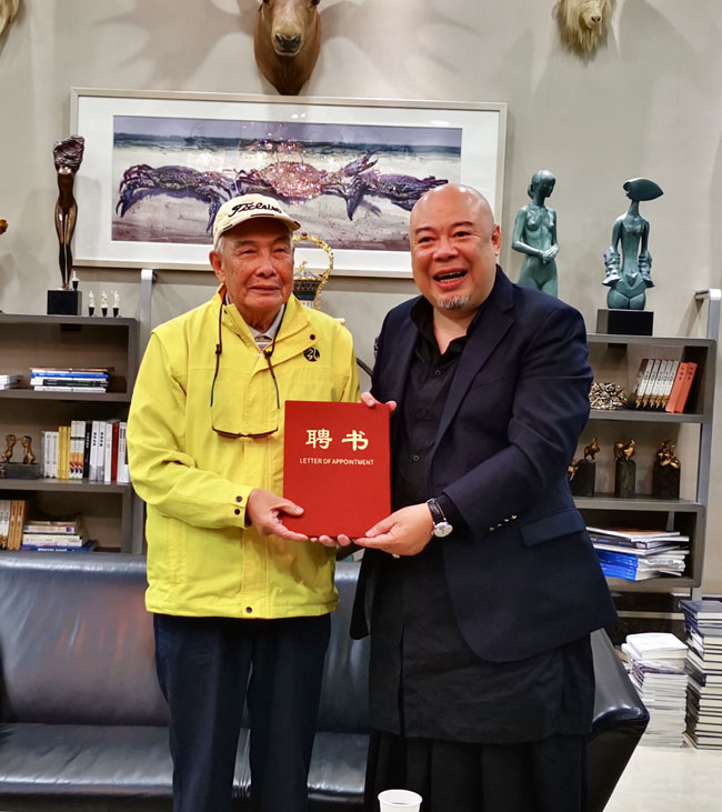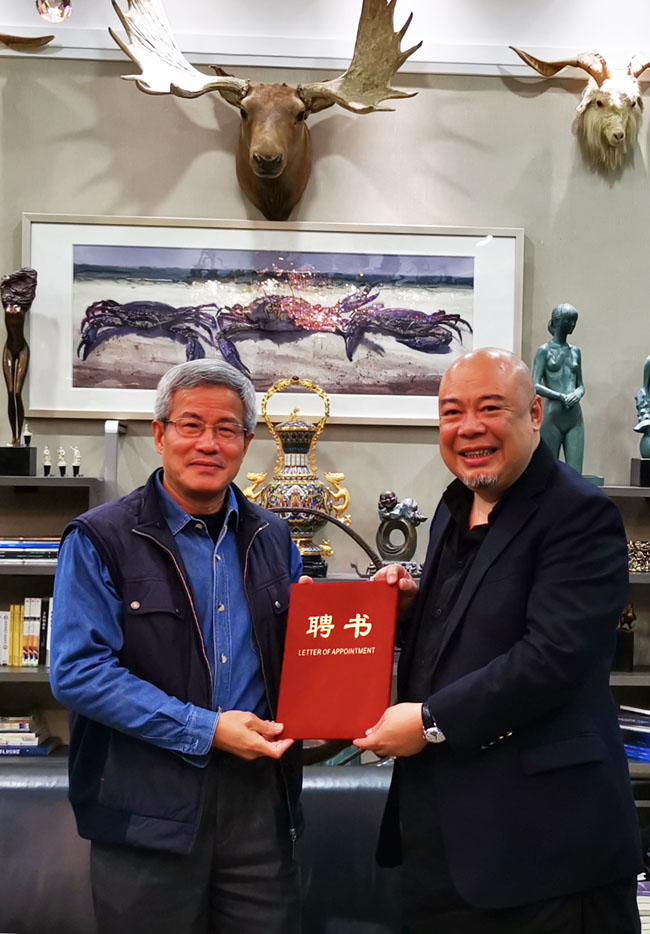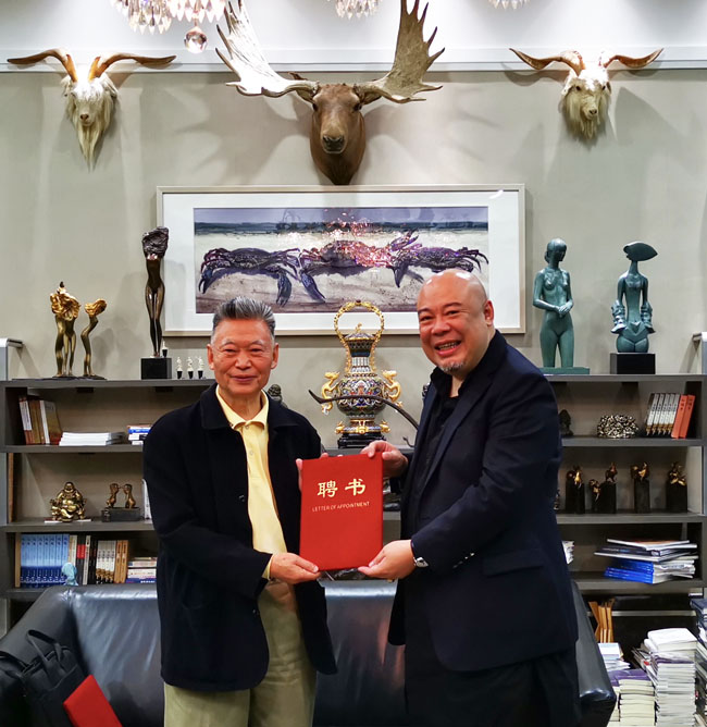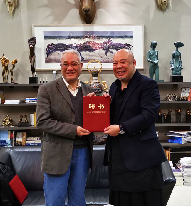 3月8日下午,郭向阳、华同旭、骆小民、刘和龙四位书法家再次莅临我院指导工作,广州华立投资有限公司董事长张智峰先生与四位书法家就中华优秀传统文化进校园活动进行了深入探讨,并达成合作共识。学院聘请四位书法家为客座教授,定期为我院学子开展相关讲座、举办书法作品展。张智峰董事长亲自为四位书法家颁发了聘书。