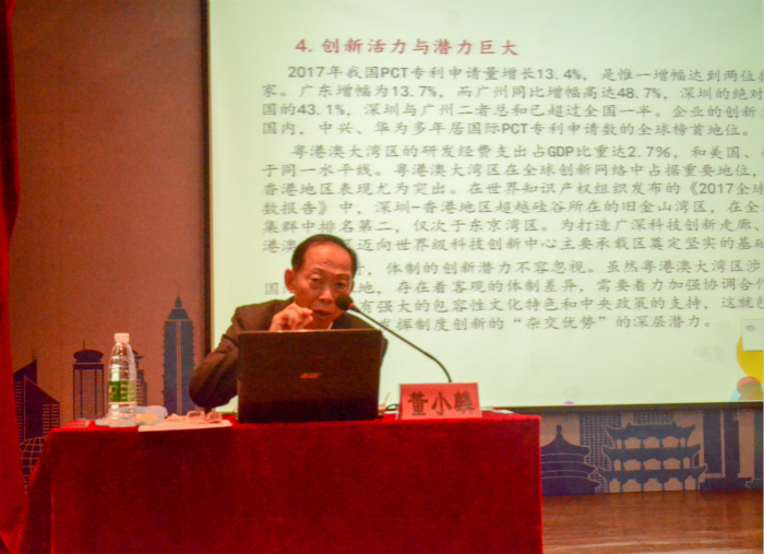 随后,董小麟教授通过解读《粤港澳大湾区发展规划纲要》,肯定广东在历史上开放发展的理念,但也指出其中的短板与不足,表明其需在大湾区建设中不断提升发展质量,强化区域创新力,构筑人才高地,增加科研专利成果,不断完善各方各面的建设,更好地把粤港澳大湾区打造为国际一流湾区。
