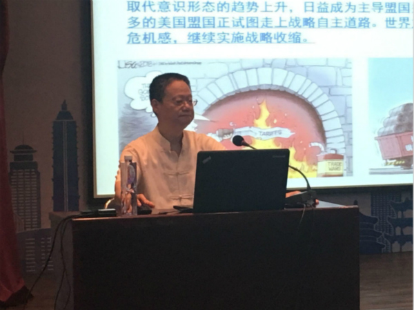 讲座上,张伟超教授从中国共产党十九大对天下大势的概括讲起,介绍了中美贸易战的大背景,并对中美贸易战的多重原因、中美贸易战的基本态势以及围绕贸易战的战略博弈进行了生动、深刻的讲解,并指出了中美贸易战的发展走势以及对方方面面的影响。