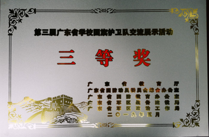 5月8日上午,第一届广东省学校国防教育成果展示活动在广州市番禺区举行,我校国旗护卫队在本次比赛中荣获三等奖。
