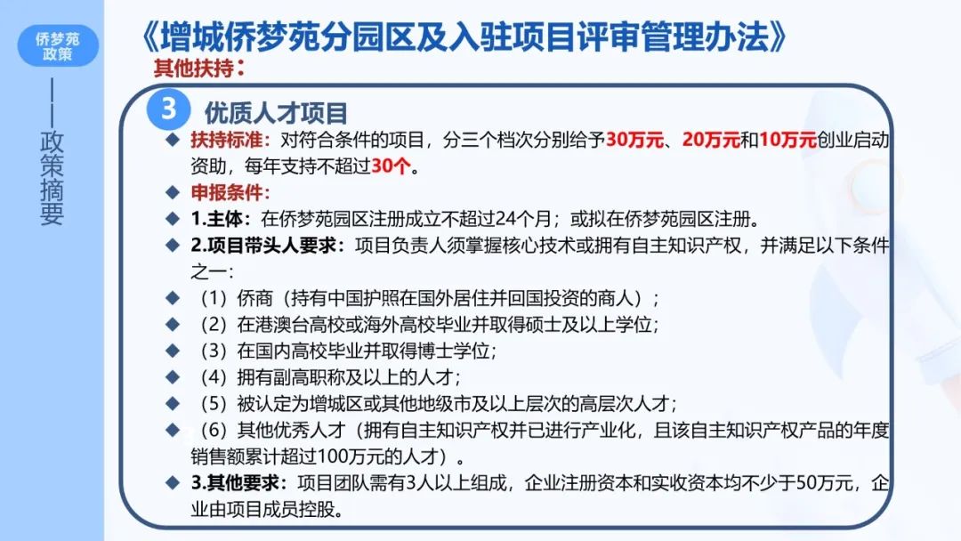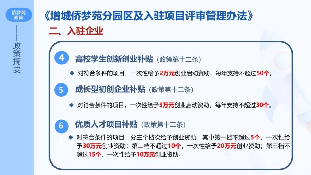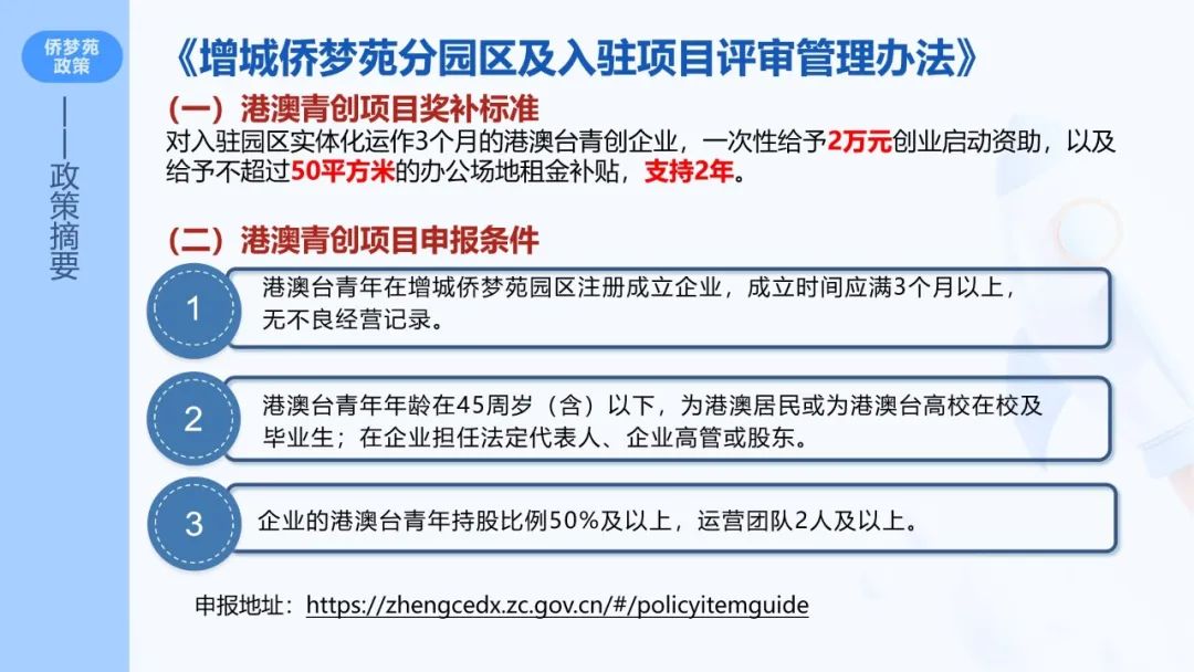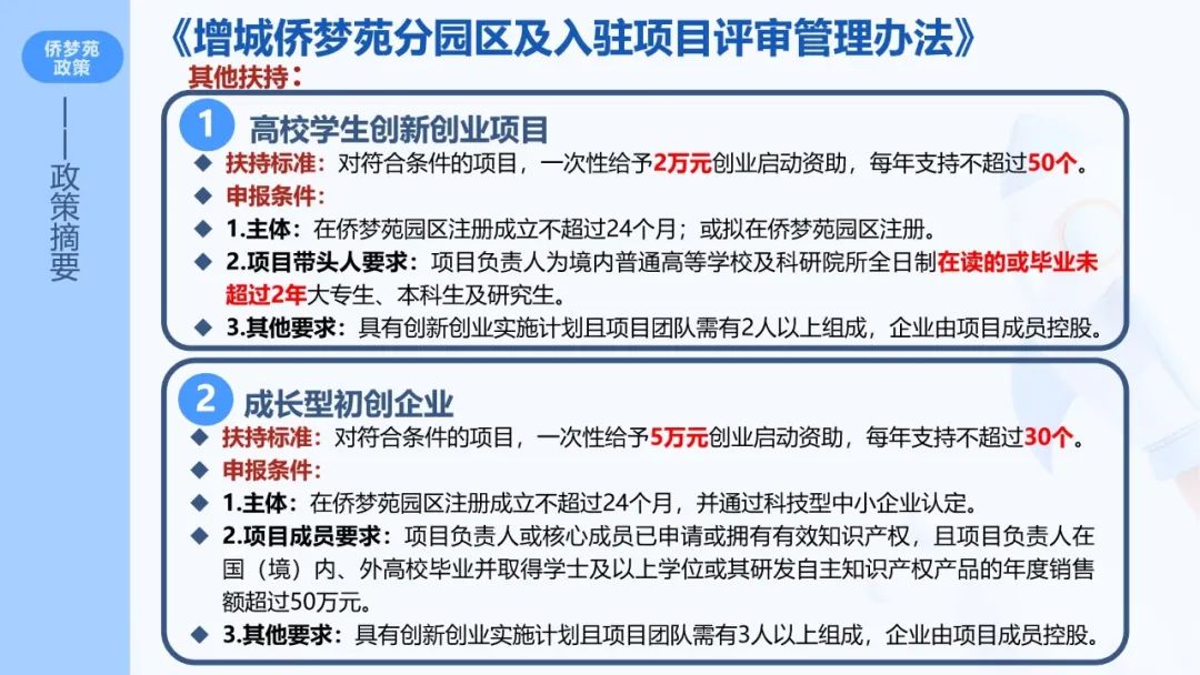 据悉,2015年12月22日,由国务院侨务办公室和广州市政府共同打造的全国第5家国家级侨商产业聚集区和海归人才、海外高端人才聚集区——增城侨梦苑,在增城经济技术开发区正式挂牌成立,其建设思路是拓园区、拓对象、提效率、造环境,并颁发一系列优惠政策,对于入孵项目/企业给予2-30万元一次性补助,详情可见《增城侨梦苑分园区及入驻项目评审管理办法》。