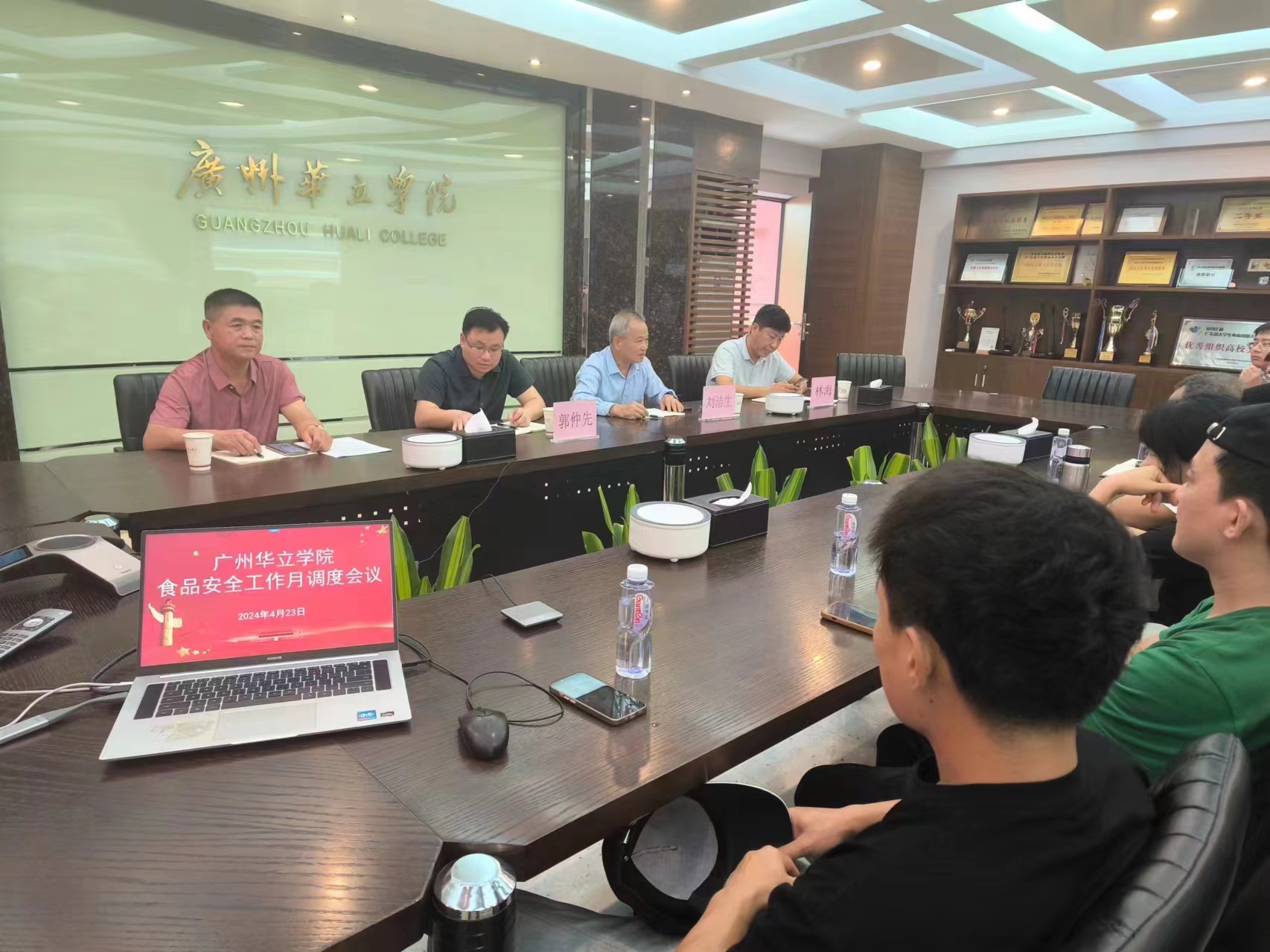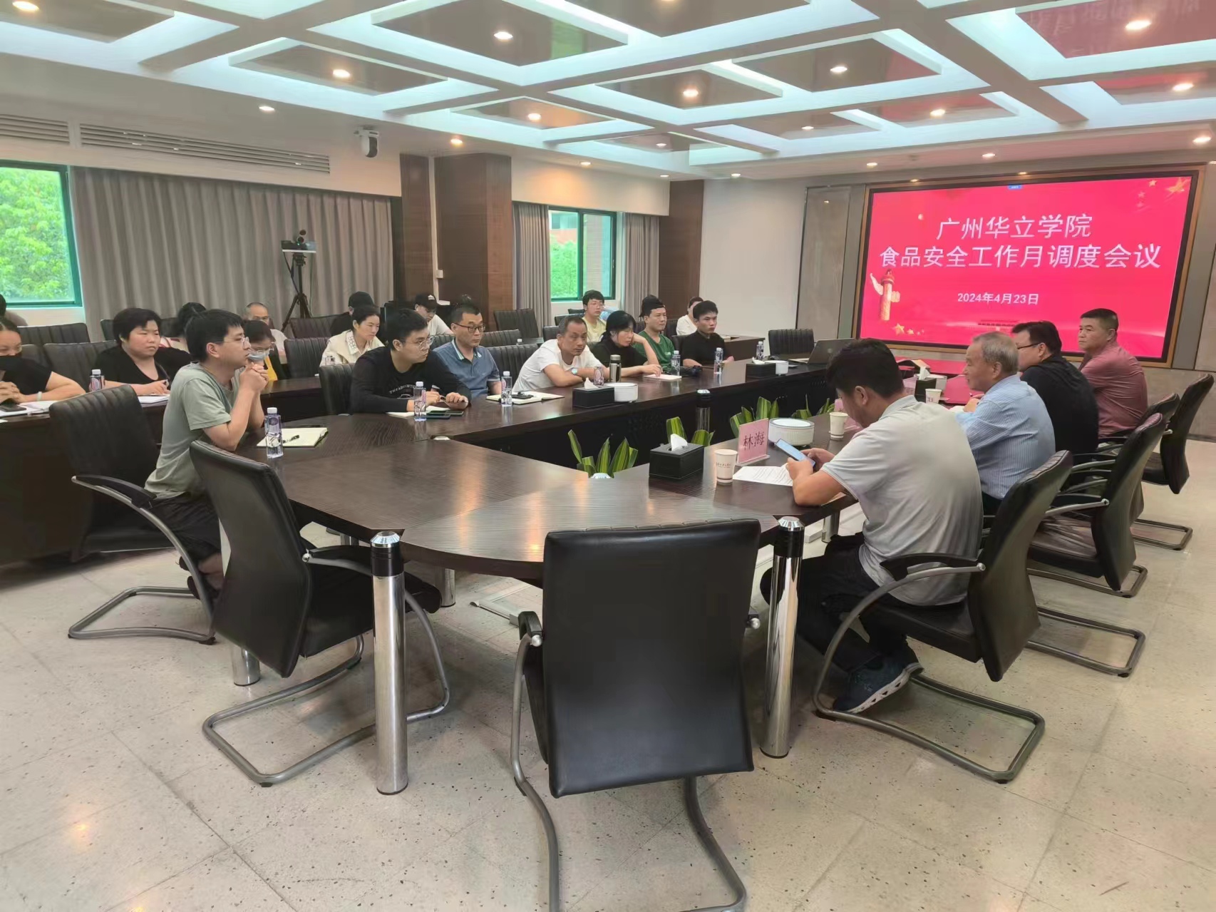 4月23日,广州华立学院膳食委员会月调度会议在学校会议室顺利举行。校长刘洁生、副校长郭仲先、总务处长林海以及商铺管理中心闫红印主任,与膳食委员会成员共同出席了此次会议。