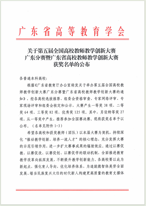 近日,由广东省教育厅指导,广东省高等教育学会、广东外语外贸大学主办的第五届全国高校教师教学创新大赛广东分赛暨广东省高校教师教学创新大赛在广东外语外贸大学圆满落幕,我校参赛教师及其团队凭借优异表现,在赛事中脱颖而出,共斩获4项优秀奖,实现了我校在该项教学竞赛中的重大突破!