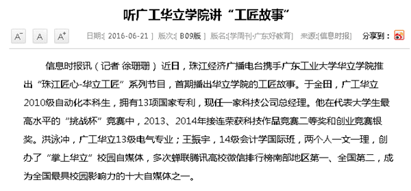 【信息时报】:珠江经济广播电台携手广工华立学院推出“珠江匠心-华立工匠”系列节目 作者:学院办公室 发布时间:2016-06-21 00:00:00 浏览次数:次 【字体:小 大】 分享到: 【打印正文】
