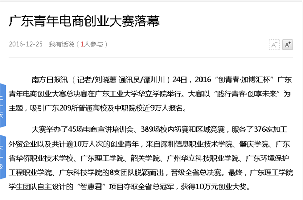 【南方日报】:广东青年电商创业大赛落幕(在广工华立学院举行)