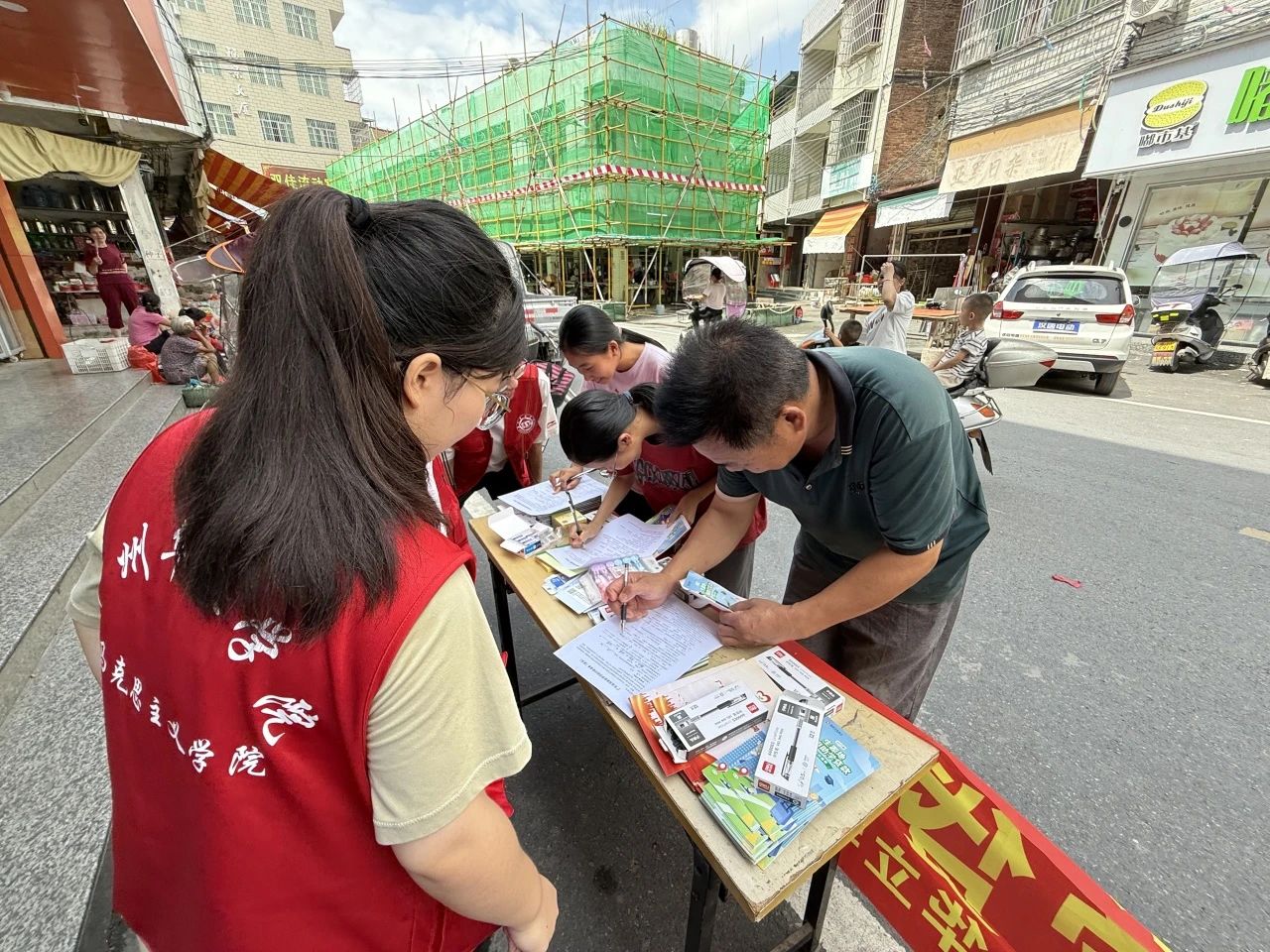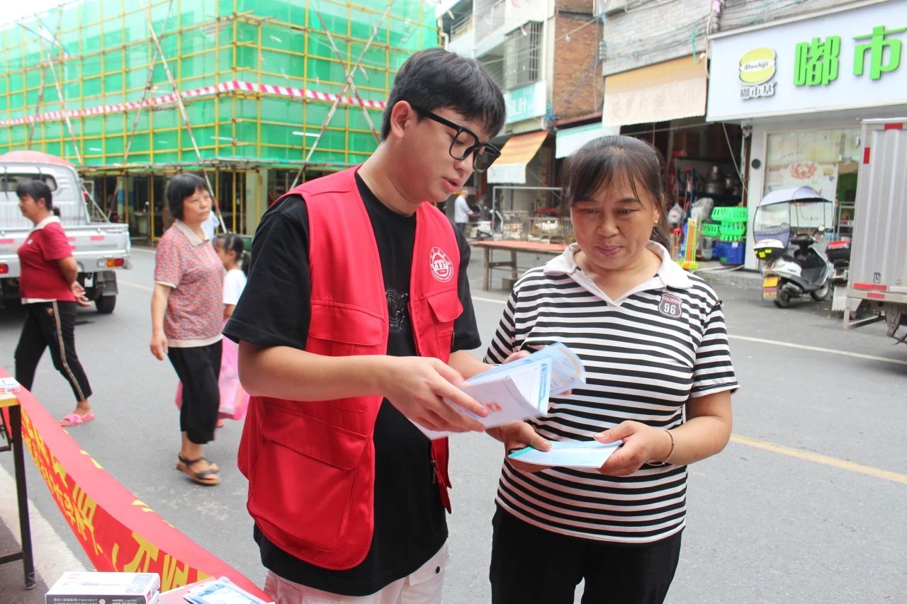 7月14日上午,资助宣传组深入农村社区,在梅州市双华镇浪兴商场旁,设立了“资助政策咨询点”。为当地居民带来家门口的便利,利用买菜、逛街的时间,就能把国家的好政策了解清楚。