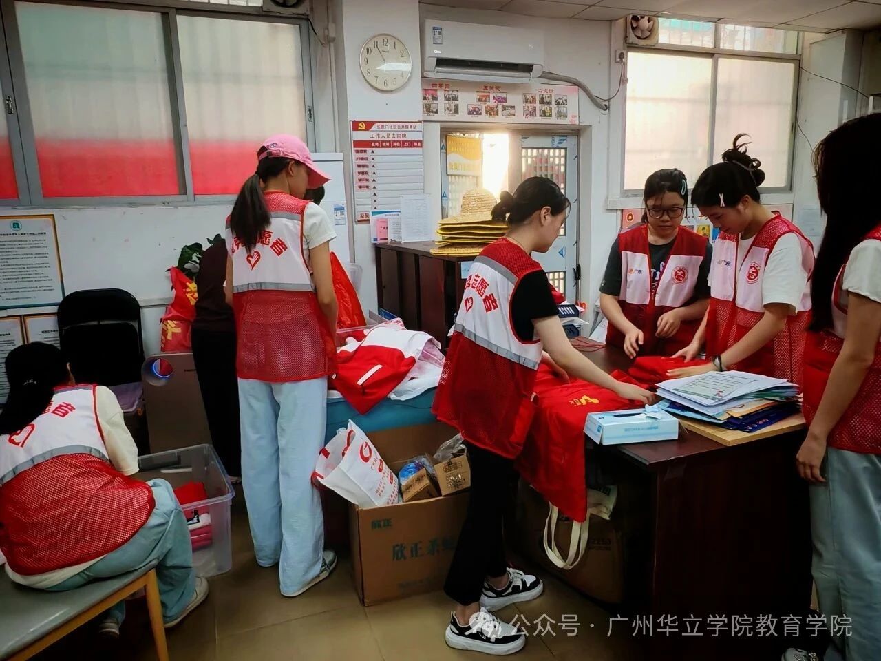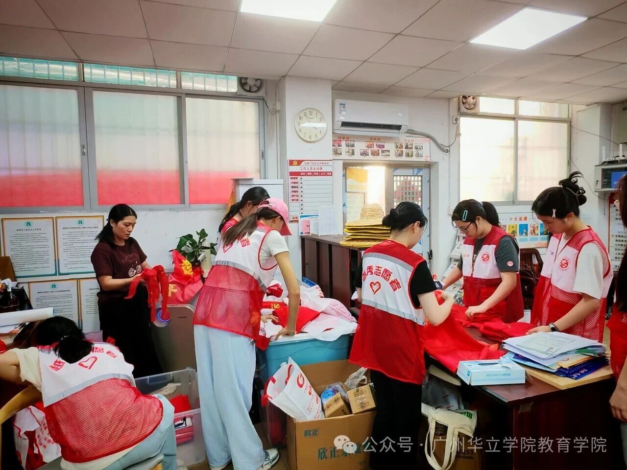 下午,在社区的一间办公室里,阳光透过窗户,映照着一群忙碌而温暖的身影。团队成员们在帮助社区整理志愿者服装,用实际行动为社区志愿服务助力。
