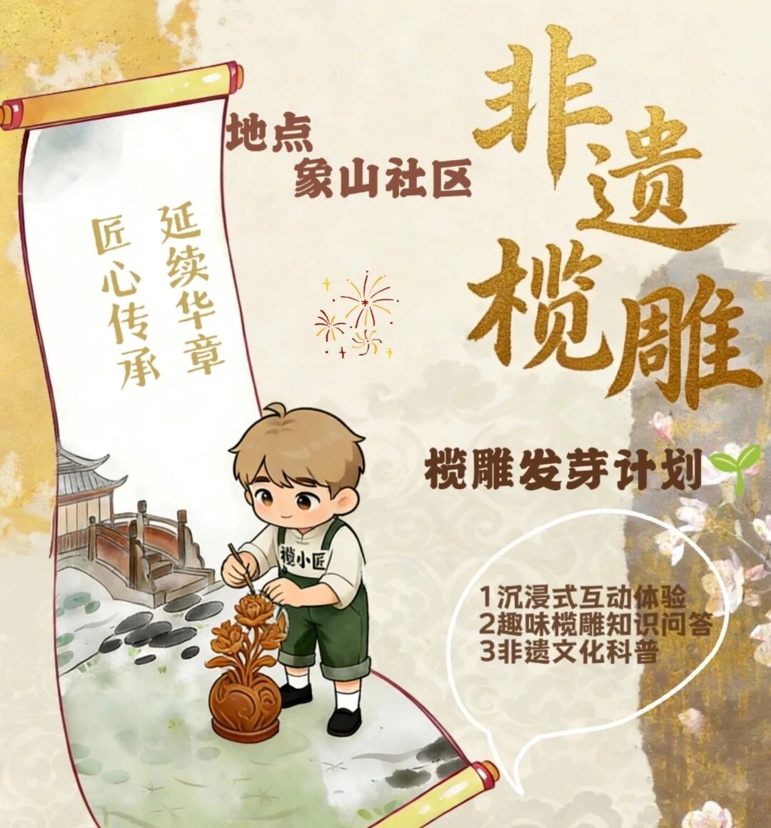 活动开始,团队进行分工合作,以"让千年技艺贴近生活,让文化传承扎根民心"为核心宗旨,精准对接群众文化需求,布局非遗榄雕宣传活动预热,深入社区科普榄雕来源、技艺与传承故事,接着由负责人通过PPT系统宣讲非遗榄雕文化,用通俗化语言拆解知识要点,搭配互动体验等一系列活动进行宣传。此次活动拉近了非遗与大众的距离,让榄雕文化在社区的烟火气中焕发出蓬勃新生机。