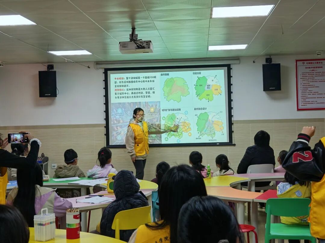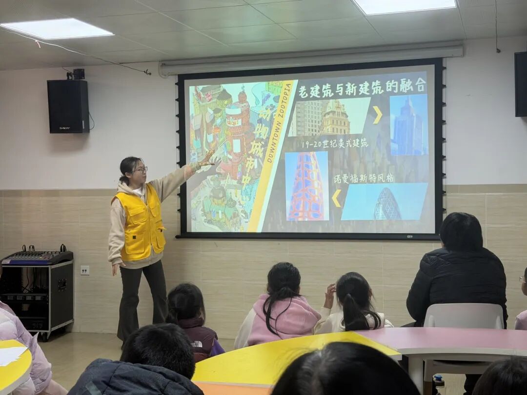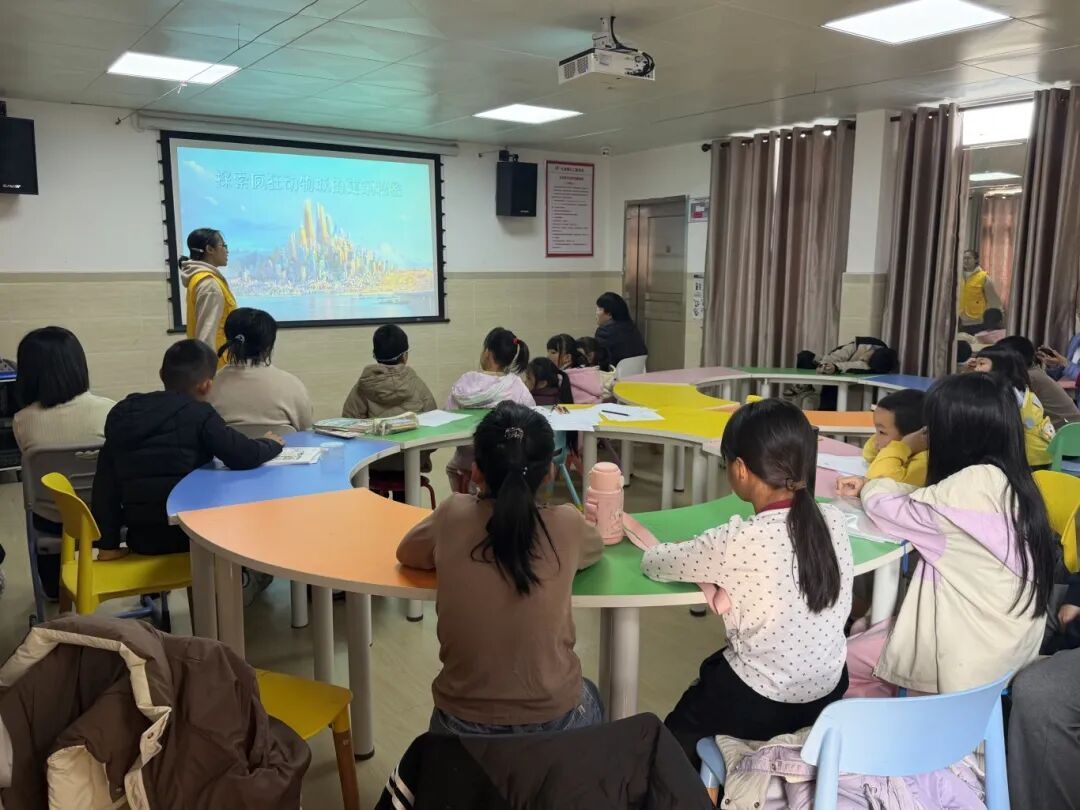 志愿者们以经典动画电影《疯狂动物城》为教学载体,引导孩子们细致观察不同动物的生活习性与居住建筑的适配逻辑——从大象家高挑开阔的门厅设计,到仓鼠镇精巧便捷的微型通道布局,生动解读了“适应性规划”等专业建筑理念。