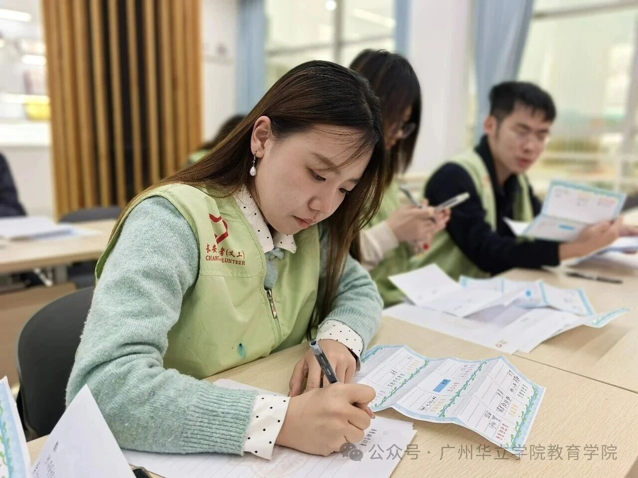 桌前伏案的身影专注如初春静水:浅绿背心上“共青团”红标醒目,笔尖沙沙划过表格,身旁同伴亦低头记录、翻阅教案。窗外楼宇朦胧,窗内纸页翻飞。