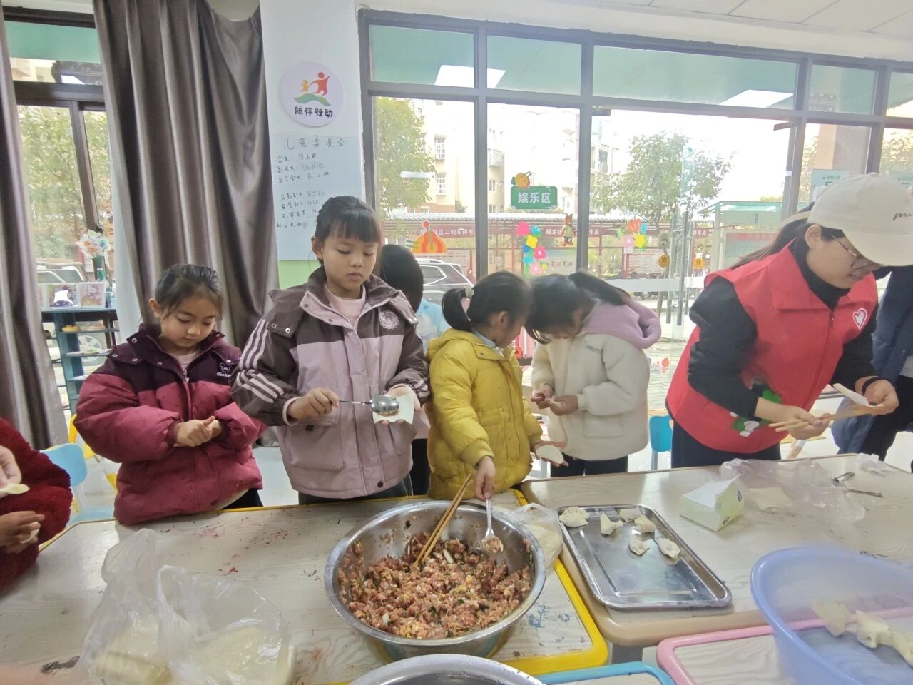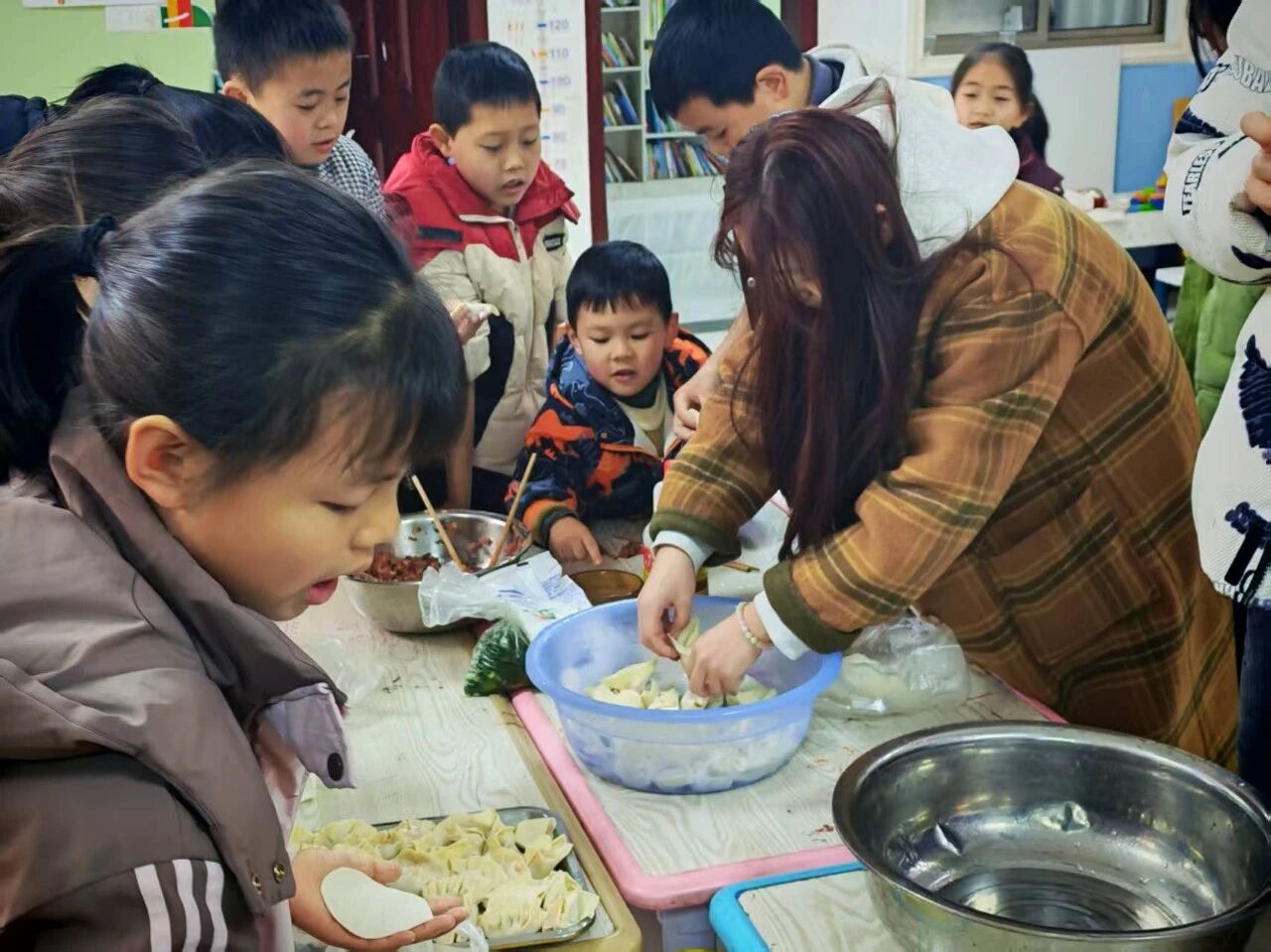 最后一天的午餐,全体老师和孩子们在教室里共同制作水饺。从准备食材和调制饺子馅料的努力到包饺子和煮饺子的默契,大家都共同营造出一份团结友爱的氛围。那一个个水饺仿佛不是一种食物,而是大家友谊和缘分的参与者。