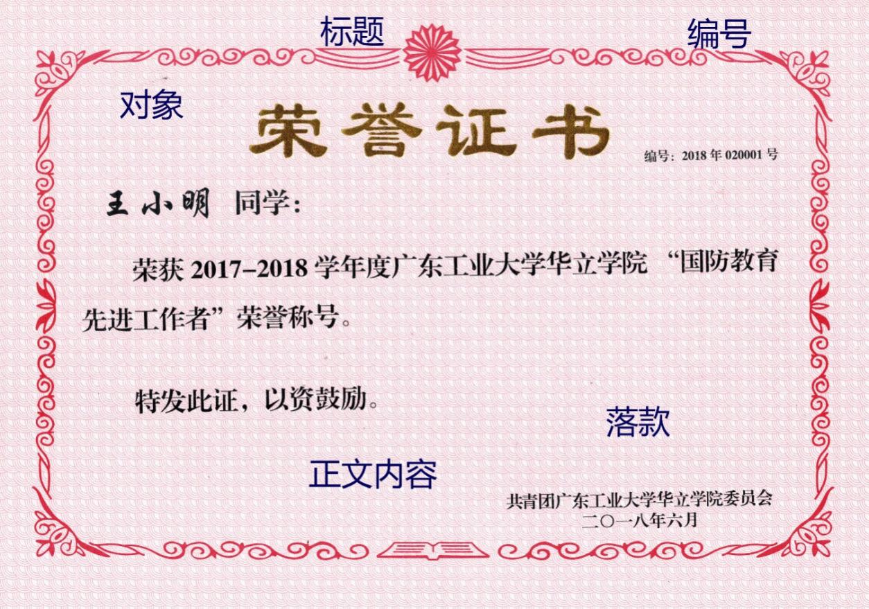 一份完整证书须有标题、对象、正文内容、落款及编号,以荣誉证书为例: