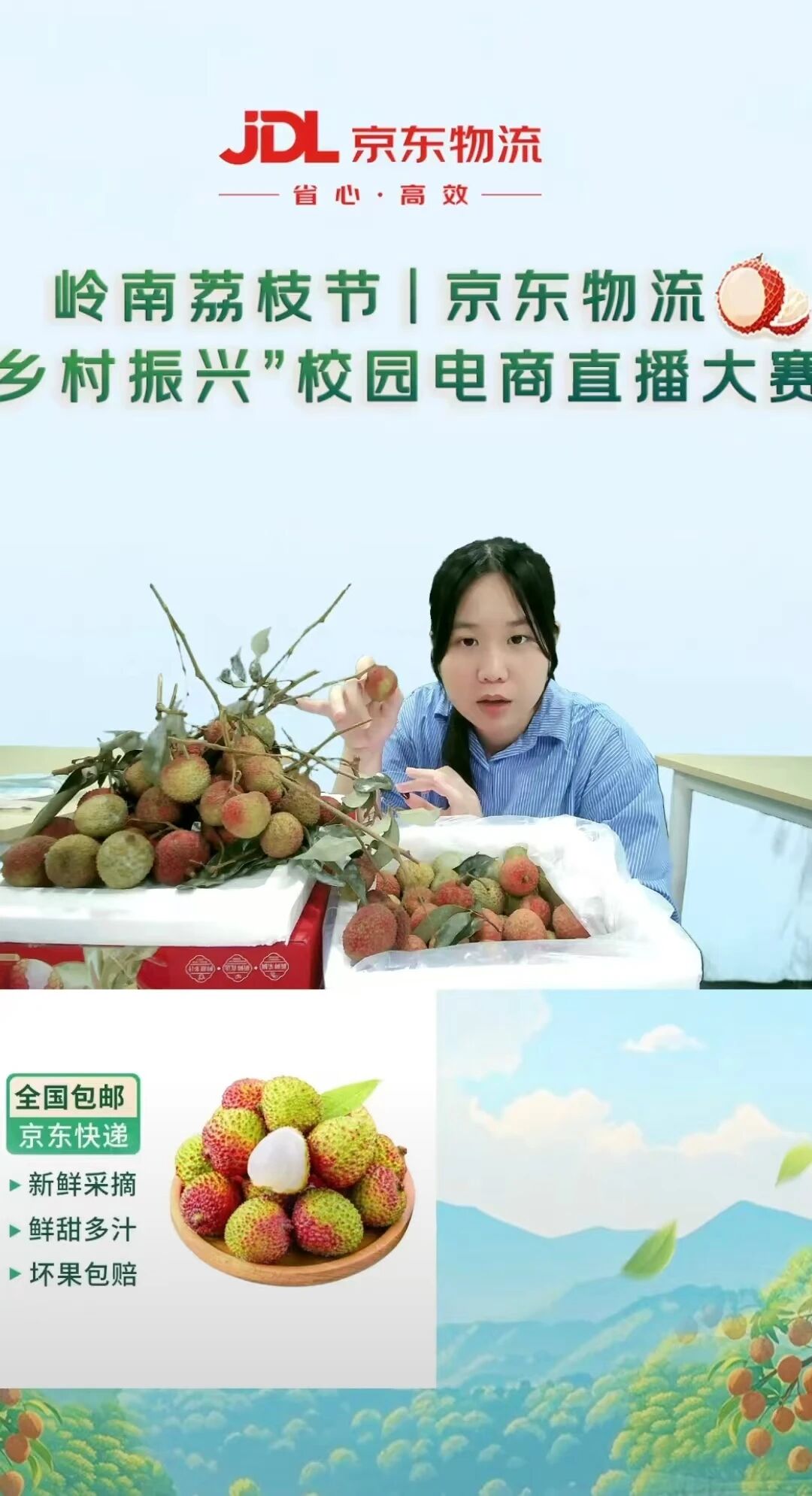 在为期一个多月的赛事中,我校各队伍深度参与直播运营、路演答辩全流程,在京东直播平台推广荔枝及周边产品。