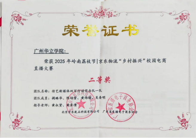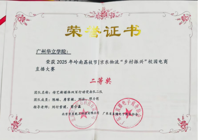 广州华立学院三支参赛团队,在京东物流“乡村振兴”校园电商直播大赛中一举拿下二等奖2项和三等奖1项,展现了华立学子助力乡村振兴的责任担当与专业实力。